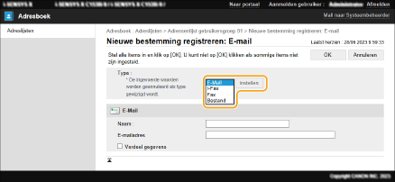 4 | Registreer de benodigde gegevens en klik op [OK]. De weergegeven items verschillen afhankelijk van het type bestemming. Voor meer informatie over gegevens die moeten worden geregistreerd, raadpleegt u Bestemmingen registreren in het adresboek. |