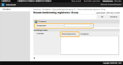 2 | Voer een naam voor de groep in bij [Groepsnaam] en klik op [Bestemming kiezen] voor [Ledenlijst]. ![]() |