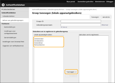 Klik op [Groep toevoegen (lokale apparaatgebruikers)...] of [Groep toevoegen (andere gebruikers)...].