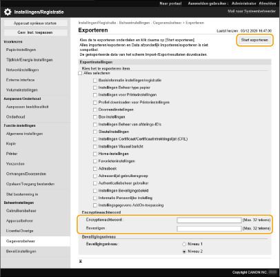 Als u alle instellingengegevens wilt versleutelen, selecteert u [Niveau 2] in [Beveiligingsniveau].