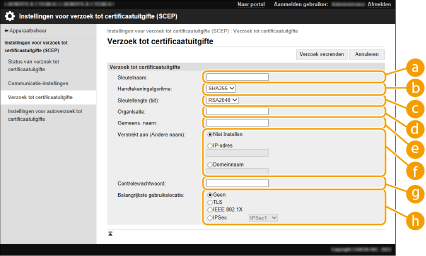 Een verzoek tot uitgifte van het certificaat dat nodig is voor sleutels die met de machine worden gegenereerd, kan worden verzonden naar een SCEP-server (Simple Certificate Enrollment Protocol) die certificaten beheert. Certificaten die vanaf de SCEP-server worden uitgegeven, worden automatisch op de machine geregistreerd. U kunt alleen een verzoek tot uitgifte van een certificaat verzenden als u Administrator-bevoegdheden hebt.