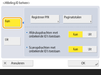 Controleer of afdelings-ID's zijn ingesteld voor de gebruikers die op de machine zijn geregistreerd. Gebruikersgegevens op het lokale apparaat registreren Afdelings-ID-beheer is alleen geldig voor gebruikers die zijn geregistreerd bij het lokale apparaat. Als u zich aanmeldt als gebruiker met beheerdersbevoegdheden, worden automatisch een systeembeheer-ID en pincode toegewezen en beheerd als afdelings-ID. |