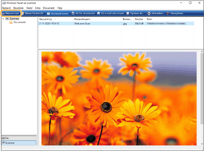Wanneer het scannen is voltooid, wordt het gescande document weergegeven in de lijst met bestanden op het scherm [Windows Faxen en Scannen] en opgeslagen in de map [Gescande documenten] van [Documenten].