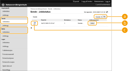 Start Fjernkontroll  [Statusovervåking/avbryte]  [Jobbstatus] under [Sende] eller [Motta]
