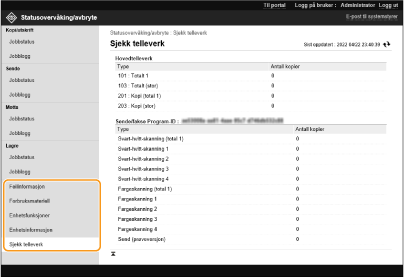 Du kan bruke Fjernkontroll til å sjekke statusen til dokumenter som venter på å bli behandlet, samt loggene for dokumenter som har blitt behandlet. Du kan også sjekke statusen til maskinen, for eksempel feilinformasjon og gjenværende mengde forbruksmateriell.