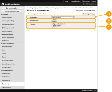 3 | Konfigurer de nødvendige innstillingene. ![]() [Adresselister]Velg adresselistene du vil eksportere. Etter at adresselistene er lagret, tilbakestilles navnene på adresselistene til fabrikkinnstillingene. [Sikkerhetsnivå]Du kan angi sikkerhetsnivået hvis [Egendefinert format] er valgt i [Filformat]. Når [Nivå 1] er valgt, kan du importere til alle Canon-multifunksjonskrivere. Når [Nivå 2] er valgt, krypteres passordet for dataene i adresselisten med en sikrere metode enn [Nivå 1]. Dataene kan imidlertid bare importeres til maskinmodeller som støtter [Nivå 2]-innstillingen (modeller der [Sikkerhetsnivå]-innstillingen vises). [Filformat]Velg filformatet for dataene som skal eksporteres. Velg [Egendefinert format] når du vil importere all informasjonen som er registrert i adresselistene til en annen Canon-multifunksjonsskriver, eller velg [LDAP-format] eller [CSV-format] hvis filen skal brukes av et dataprogram. Hvis [LDAP-format] er valgt, lagres bare e-postadressene og faksnumrene. ![]() Angi et passord for eksporterte data Angi <Inkluder passord ved eksport av adressebok> til <På> (<Inkluder passord ved eksport av adressebok>). Når denne innstillingen er konfigurert, vises elementene for å skrive inn passordet på [Eksporter adresselister]-skjermen. Hvis det er angitt et passord, kan dataene bare importeres dersom det riktige passordet skrives inn. Redigere data eksportert i CSV-format Mer informasjon om hver kolonne i adresseboken finner du under Adressebokelementer. Det kan hende at data ikke kan importeres riktig når du importerer til en eldre versjon av maskinen. |