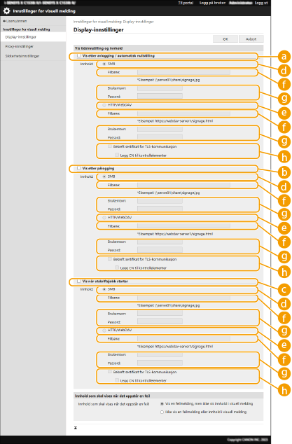 Når Visuell melding-funksjonen er innstilt, kan innhold sjekkes fra <Visuelt varsel> på <Hjem>, uavhengig av tidsinnstillingen. Det sist viste innholdet vises. Angi en fil som er lagret på en filserver eller i Avansert område i en annen Canon flerfunksjonsskriver i samme nettverk som innholdet som skal vises. Arbeide med andre enheterDu kan også angi et nettsted på Internett som innhold via en proxy-server. Proxy-innstillingene som brukes for denne funksjonen er de samme som innstillingene i <Proxy-innstillinger>. Innholdet vises når utskriften starter hvis funksjonen utskrift med tvungen holding er aktivert og avmerkingsboksen [Vis når utskriftsjobb starter] er valgt. |