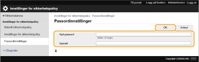 Tast inn det nåværende passordet i [Gammelt passord:], og klikk på [OK] uten å angi en verdi for [Nytt passord:] eller [Bekreft:] (la dem være tomme). Hvis det er konfigurert tegnbegrensning ved inntasting i [Policy for passordinnstillinger], må det angis en verdi for denne innstillingen. Fjern begrensningen før du fjerner passordet.