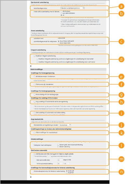 Hvis du vil deaktivere den integrerte godkjenningsfunksjonen kun for påloggede brukere som er registrerte på den lokale enheten, krysser du av i boksen for [Deaktiver integrert autentisering ved bruk av legitimasjon for autentisering for lokal enhet].