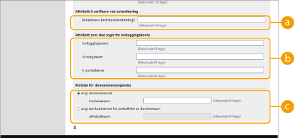 4 | Angi hvordan attributtnavnene og domenenavnet skal angis. ![]() [Brukernavn (tastaturautentisering):]Angi LDAP-datafeltet (attributtnavn) for brukernavnet på LDAP-serveren (Eksempel: uid). [Innloggingsnavn:] / [Visningsnavn] / [E-postadresse]Angi LDAP-datafeltene (attributtnavn) for innloggingsnavnet, visningsnavnet og e-postadressen til hver brukerkonto på LDAP-serveren (Eksempel: uid, cn, mail). [Angi domenenavnet] / [Angi attributtnavnet for anskaffelse av domenenavn]Velg hvordan domenenavnet til innloggingsstedet skal angis. Hvis du vil angi domenenavnet direkte, velg [Angi domenenavnet] og skriv inn domenenavnet. For å angi et LDAP-datafelt (attributtnavn) som domenenavnet på LDAP-serveren skal skaffes fra, velg [Angi attributtnavnet for anskaffelse av domenenavn] og skriv inn attributtnavnet (Eksempel: dc). |