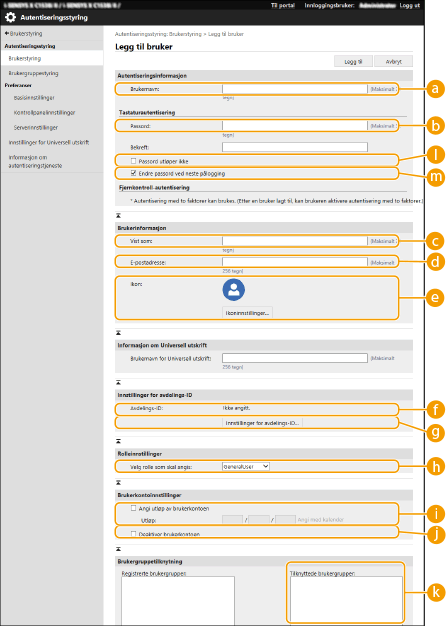 dc | Nei | 0 til 32 tegn | Kontrolltegn | - (I/A) | Kan ikke endres. Det vil automatisk bli tilordnet for følgende brukere. Brukere registrert etter servergodkjenning |