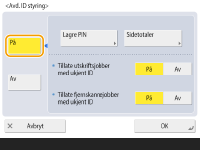3 | Angi avdelings-ID og PIN-kode og trykk på <OK>. ![]() <Avdelings-ID>Tast inn et tall med sju sifre eller mindre for avdelings-ID-en. <PIN>Tast inn et tall med sju sifre eller mindre for PIN-koden og trykk på <Bekreft>. For å bekrefte angir du PIN-koden på nytt og trykker på <OK>. Hvis du ikke vil angi en PIN-kode, lar du dette feltet være tomt. ![]() Du kan ikke registrere en avdelings-ID eller PIN-kode som består bare av nulltall, for eksempel "00" eller "0000000". Selv om du legger inn færre enn syv sifre, legges det til nuller i begynnelsen av tallet, og et syvsifret tall stilles inn. Du kan trykke på <Slå gense på/av og angi sidegrense> eller å angi det totale antallet sider som avdelingen har lov til å bruke til kopiering, skanning og utskrift. Du kan også gjøre det å angi syv sifre til et krav for avdelings-ID-ene og PIN-kodene. For mer informasjon tar du kontakt med din forhandler. Maskinen stopper utskrift dersom en av sidegrensene for farge eller svart og hvit er nådd under utskrift av et dokument som inneholder områder med både farge og svart-hvitt. Maskinen stopper kopiering dersom en av sidegrensene for farge eller svart-hvit utskrift eller kopigrensen er nådd under kopiering av et dokument som inneholder områder med både farge og svart-hvitt. |