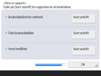 Du kan skrive ut nettverksbrukerlisten, fakse brukerdatalisten og justert verdiliste. ![]() ![]() Trykk på <Start utskrift> for rapporten du vil skrive ut. Når utskriften er fullført, eller hvis du ikke skriver ut en liste, trykker du på <OK>. | |