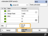<Registrera ny mottagare>, <Detaljer/redigera> och <Radera> i <Registr./redig.> på skärmen <Adressbok (lokalt)> kan användas för att registrera nya mottagare, kontrollera detaljer och redigera/ta bort mottagare. För att använda fjärradressboken är det nödvändigt att konfigurera servermaskinens inställningar. Ange om du vill öppna fjärradressboken externt på servermaskinen. |