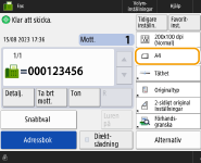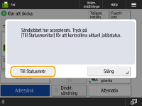 Om du vill kontrollera det totala antalet mottagare som har angettsDet totala antalet mottagare som har angetts visas högst upp till höger på skärmen. Det gör det möjligt för dig att bekräfta att antalet mottagare är korrekt före sändning. ![]() För att skicka med avsändarinformationDu kan skicka med avsändarens namn och faxnummer. <Eget sändar-ID> För att kontrollera status för skickade dokumentPå skärmen <Statusmonitor> kan du kontrollera statusen för skickade dokument. På den här skärmen kan du skicka fax igen eller avbryta sändning när du har kontrollerat statusen. Kontrollera status och logg för avsända och mottagna dokument När <Visa meddelande när ett jobb accepteras> är inställt på <På>, kan skärmen <Statusmonitor> visas från följande skärm som visas när ett sändjobb har tagits emot. <Visa meddelande när ett jobb accepteras> ![]() Om ett sändningsfel inträffar på grund av att mottagarens linje är upptagenMaskinen ringer upp igen mottagaren på nytt efter en viss tid. Du kan ändra inställningarna för exempelvis hur många gånger som maskinen ringer upp igen eller hur lång tid som ska förflyta mellan uppringningarna. <Automatisk återuppringning> För att skriva ut rapporten med sändningsresultatPå skärmbilden med grundläggande faxfunktioner, tryck på <Alternativ> <TX resultatrapport> om du vill ange att sändrapporten ska skrivas ut automatiskt.Om du vill ställa in det här för varje jobb med <Alternativ>, måste du välja <Endast för fel> eller <Av> i <TX resultatrapport> och sedan ställa in <Tillåt utskrift från tillval> på <På>. Om foton i den skickade bilden är för mörka eller om ljusa färger i bakgrunden i färgoriginal inte kan raderasKvaliteten på den skickade bilden kan förbättras om följande villkor/inställningar uppfylls. Jobbtyp: Fax (minnessändning) eller Scanna och skicka (fax/I-fax) <Välj färg>: <Svartvitt> (Scanna och skicka) <Originaltyp>: <Text> <Täthet> <Bakgrundens täthet>: <Auto><Upplösning>: 200 dpi x 400 dpi, 300 dpi x 300 dpi*, 400 dpi x 400 dpi eller 600 dpi x 600 dpi* * Kan ställas in för Scanna och skicka <Prio. hastighet/bildkvalitet för svartvit scanning> Fax/I-Fax sändjobb: <Prioritera kvalitet> (<Prio. hastighet/bildkvalitet för svartvit scanning>) |