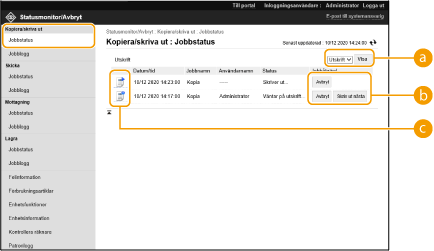 Du kan kontrollera status för dokument som väntar på att kopieras eller skrivas ut. Du kan också skriva ut ett dokument före andra eller avbryta ett dokument.