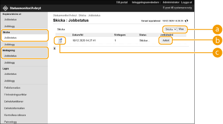 [Jobbstatus] under [Skicka] eller [Mottagning]