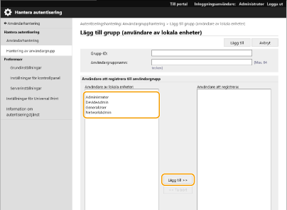 Klicka på [Användarhantering]  [Hantera autentisering]  [Hantering av användargrupp].