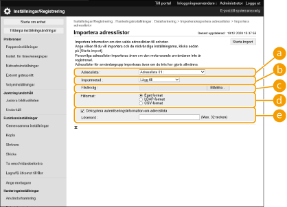 3 | Konfigurera de inställningar som behövs. ![]() [Adresslistor]Välj den adresslista som är importmottagare. [Importmetod]Välj [Lägg till] om du vill lägga till importerade mottagare utan att radera den aktuella adresslistan, eller välj [Ta bort och skriv över] om du vill ta bort den aktuella adresslistan och skriva över data med de importerade mottagarna. [Filsökväg]Klicka på [Välj fil] och ange vilken fil som ska importeras. [Filformat]Välj filformatet för data som ska importeras. Välj [Eget format] för filer i det dedikerade formatet för Canon flerfunktionsskrivare (*.abk), välj [LDAP-format] för filer i LDAP-format (*.ldif), eller välj [CSV-format] för filer i CSV-format (*.csv). [Dekryptera autentiseringsinformation om adresslista]När du importerar krypterade filer markerar du kryssrutan och anger samma lösenord som angavs när inställningsdata exporterades. |