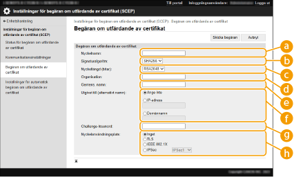 En begäran för att utfärda det certifikat som krävs för nycklar som genereras med enheten kan skickas till en SCEP-server (Simple Certificate Enrollment Protocol) som hanterar certifikat. Certifikat som utfärdas från SCEP-servern registreras automatiskt för enheten. Administrator-behörighet krävs för att skicka en begäran för att utfärda certifikat.