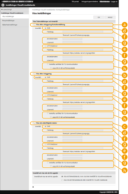 När funktionen Visuellt meddelande är inställd kan innehållet kontrolleras med <Visuellt meddelande> på <Hem> oavsett tidpunkt. Det senaste visade innehållet visas. Ange en fil som har sparats på en filserver eller i Avancerat utrymme för en annan Canon-flerfunktionsskrivare i samma nätverk som innehållet som ska visas. Arbeta med andra enheterDu kan också ställa in en webbplats på internet som innehåll via en proxyserver. Proxyinställningarna som används för den här funktionen är desamma som inställningarna i <Proxyinställningar>. Innehållet visas när utskriften startar om funktionen för tvångsparkerad utskrift har aktiverats och kryssrutan [Visa när utskriftsjobb startar] är markerad. |