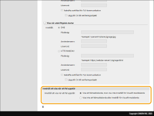 [Bekräfta certifikat för TLS-kommunikation]/[Lägg till CN till verifieringsobjekt]Ange om det TLS-servercertifikat ska verifieras som skickats vid anslutningen och dess CN (Common Name, vanligt namn).