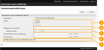 Kontrollera kommunikationsloggen för synkroniseringDu kan kontrollera kommunikationsloggen från skärmen för att synkronisera egna inställningar. Loggen kan även laddas ner som en fil. "Varning" registreras som nivån där servermaskinen tillfälligt inte kan kommunicera. "Fel" registreras som nivån där den högsta mängden data som kan registreras har överskridits eller om autentisering med servermaskinen misslyckas. Enkla synkroniseringsinställningarSynkronisering av egna inställningar kan startas från kontrollpanelen på Canon flerfunktionsskrivare med samma router. För klientmaskinen: Tryck på (Inst./register) <Hanteringsinställningar> <Enhetshantering> ställ in <Synkronisera egna inställningar (klient)> på <Aktivera>.Användarautentisering måste vara aktiverad som autentiseringsmetod. Viktigt om synkronisering avbrytsOm en klientmaskin avbryter synkroniseringen av egna inställningar kan inte klientmaskinen återställa inställningarna för varje användare registrerad på servermaskinen. Observera därmed att egna data på maskinen som var en klientmaskin kan sakna den senaste datan efter att synkroniseringen av egna inställningar har avbrutits. |