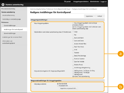 Du kan ställa in användarinloggningsmetoder, autentiseringsenheter och andra autentiseringsfunktioner baserat på din systemmiljö och dina behov. Du kan också ange hur skärmen för inloggning visas.