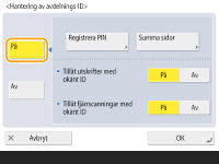 3 | Ange avdelnings-ID och -PIN och tryck på <OK>. ![]() <Avdelnings-ID>Ange ett tal med 7 siffror eller mindre för avdelnings-ID. <PIN-kod>Ange ett tal med 7 siffror eller mindre för PIN-koden och tryck på <Bekräfta>. För att bekräfta, ange PIN-koden igen och tryck på <OK>. Om du inte vill ställa in en PIN-kod, lämna det här alternativet tomt. ![]() Du kan inte registrera ett avdelnings-ID eller -PIN som består av enbart nollor, t.ex. "00" eller "0000000". Även om du anger färre än sju siffror, läggs nollor till i början av numret och ett sjusiffrigt nummer anges. Du kan trycka på <Slå på/av gränser och ange sidgränser> för att ange hur många sidor avdelningen får använda för kopiering, scanning och utskrift. Du kan även göra att ange sju siffror till ett krav för avdelnings-ID och -PIN. Kontakta din återförsäljare eller servicerepresentant för mer information. Utskriften stoppas om sidobegränsningen för färg eller svartvitt uppnås medan du skriver ut ett dokument som innehåller både färgade och svartvita partier. Kopieringen stoppas om den sammanlagda sidgränsen för typ eller kopiering i färg eller svartvitt uppnås medan du kopierar ett dokument som innehåller både färgade och svartvita partier. |