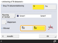 Du kan ikke udføres en direkte afsendelse, hvis du indstiller <Arkivering af TX-dokument> til <Til>. Denne indstilling skifter automatisk til <Fra> i følgende tilfælde. Angiv modtageren igen, eller sæt indstillingen tilbage til <Til>, alt efter hvad der er brug for. Når backupmodtageren er slettet fra adressebogen Når en adressebog er blevet importeret fra Remote UI (Brugerinterface til fjernbetjening)Import/eksport af indstillingsdataene Når en adressebog er blevet modtaget fra software til styring af adressebog <Import/Eksport fra Address Book Management-softw.> |