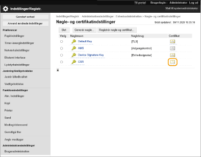 Certifikater, der er genereret på denne maskine, har ikke en CA-signatur, og det kan muligvis medføre kommunikationsfejl med nogle kommunikationspartnere. For at anmode om et certifikat med en CA-signatur er det nødvendigt med data til anmodning om signering af certifikat (CSR-data). En bruger, der logger på med administratorrettigheder, kan anmode om en CSR.