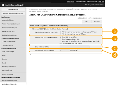 Der er to metoder til at kontrollere, om certifikater modtaget fra den anden kommunikationspart er gyldige: Sammenligning af listen med certifikattilbagekaldelse (CRL) registreret i maskinen og forespørgsel til en OCSP-respondent (Online Certificate Status Protocol – en server, der understøtter OCSP). Indstil metoden til kontrol af udløbet af certifikater ifølge dit miljø. Denne registrering kan kun udføres af administratoren.