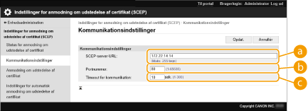 [Timeout for kommunikation:]Angiv timeouttiden for kommunikation med SCEP-serveren. Forbindelsen er annulleret, hvis der ikke er noget svar fra SCEP-serveren inden for den angivne tid.