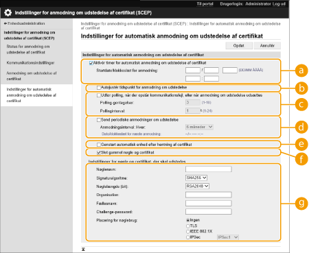 En anmodning om udstedelse af det certifikat, der kræves til nøgler, der er genereret med maskinen, kan sendes til en SCEP-server (Simple Certificate Enrollment Protocol), der administrerer certifikater. Certifikater, der er udstedt fra SCEP-serveren registreres automatisk til maskine. Der kræves Administrator-rettigheder for at sende en anmodning om udstedelse af et certifikat.