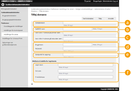 4 | Indtast de nødvendige oplysninger. ![]() [Domænenavn:]Indtast domænenavnet for det Active Directory, som er login-modtageren (Eksempel: virksomhed.domæne.com). [NetBIOS-navn]Indtast NetBIOS-domænenavnet (Eksempel: firma). [Navn på primær vært:] / [Navn på sekundær vært]Indtast hostnavnet for Active Directory-serveren eller IPv4-adressen: Ved brug af en sekundær server skal du angive navnet i [Navn på sekundær vært]. Eksempel: Benyt værtsnavn: ad-server1 Brug af IPv4-adresse: 192.168.18.138 [Brugernavn:] / [Password:]Indtast brugernavnet og passwordet til brug ved adgang til og søgning på Active Directory-serveren. [Startpunkt for søgning:]Angiv lokation for at få adgang til og søge i Active Directory-serveren. [Login-navn:] / [Vist som] / [E-mailadresse]Angiv datafelterne (attributnavne) for login-navnet, visningsnavnet og e-mailadressen for hver brugerkonto på Active Directory-serveren (Eksempel: sAMAccountName, cn, mail). |