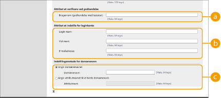 4 | Angiv, hvordan du indstiller attributnavnene og domænenavnet. ![]() [Brugernavn (godkendelse med tastatur):]Angiv LDAP-datafeltet (attributnavn) for brugernavnet på LDAP-serveren (Eksempel: uid). [Login-navn:] / [Vist navn] / [E-mailadresse]Angiv LDAP-datafelterne (attributnavne) for login-navnet, visningsnavnet og e-mailadressen for hver brugerkonto på LDAP-serveren (Eksempel: uid, cn, mail). [Angiv domænenavnet] / [Angiv attributnavnet til at hente domænenavn]Vælg, hvordan du indstiller domænenavnet for login-modtageren. For at angive domænenavnet direkte skal du vælge [Angiv domænenavnet] og indtaste domænenavnet. For at angive et LDAP-datafelt (attributnavn) fra hvilket LDAP-serverens domænenavn skal hentes, skal du vælge [Angiv attributnavnet til at hente domænenavn] og indtaste (Eksempel: dc). |