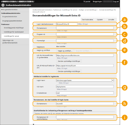 2 | Indtast de nødvendige oplysninger. ![]() [Login-destinationsnavn:]Indtast det viste navn for logondestinationen. Standardværdi: Microsoft Entra ID [Domænenavn:]Indtast domænenavnet for Microsoft Entra ID, som er logondestinationen. [Applikations-ID:]Indtast applikations-ID (klient). [Hemmeligt:]Indtast den hemmelighed, der er udstedt på Microsoft Entra ID. Når du bruger [Nøgle og certifikat ], er det ikke nødvendigt at indtaste noget her. [Nøgle og certifikat ]Klik på [Nøgle og certifikat ], når du bruger en nøgle og et certifikat. Ved at klikke på [Eksporter certifikat ] kan du eksportere det certifikat, der er registreret for Microsoft Entra ID. [URL for Microsoft Entra ID-godkendelse] / [URL til Microsoft Entra ID-API:] Indtast URL'en. Afhængigt af dit cloudmiljø kan det være nødvendigt at modificere URL'en. Klik på [Gendan oprindelige indstillinger] for at gendanne URL'en for [URL for Microsoft Entra ID-godkendelse] / [URL til Microsoft Entra ID-API:] til standardværdien. Standardværdi: [URL for Microsoft Entra ID-godkendelse]: https://login.microsoftonline.com [URL til Microsoft Entra ID-API:]: https://graph.microsoft.com [Login-navn:] / [Vist navn:] / [E-mailadresse:] Indtast datafeltnavnene (attribut), som login-navnet, visningsnavnet og e-mailadressen for hver brugerkonto er registreret for, på en Microsoft Entra ID-server. Standardværdi: WindowsLogonName, displayName, mail Eksempel: userPrincipalName, displayName, mail [Domænenavn:] I de fleste tilfælde er det ikke nødvendigt at ændre indstillingen. Standardværdi: AzureAD [Domænenavn til autofuldførelse:] Indtast det domænenavn, der indtastes automatisk. Du behøver ikke selv indtaste domænenavnet efter @. |