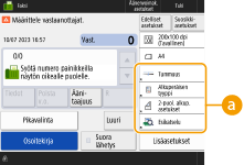 Perustoimintojen näyttöön sijoitetut asetusnimikkeet ja näytettävä sijainti vaihtelevat eri toiminnoissa. Pikapainiketta ei näytetä, jos pikapainikkeeksi on asetettu <Nimeämätön>. Tallennettavien <Lisäasetukset>-pikapainikkeiden enimmäismäärät ovat seuraavat. Kopio: 5 Faksi: 4 Skannaa ja lähetä: 2 |