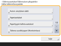 Jos <Aset./Tall.vakiopainike> ei ole näkyvissä <Päävalikko>-näytössä, valitse   <Aloitusnäytön hallinnan asetukset> <Rajoita toimintonäyttö>  <Aseta> aseta <Aset./Tall.vakiopainike> näytettäväksi.