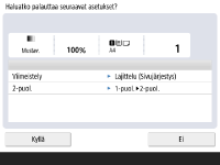 Jos valitset sekä <Kyllä>- että <Näytä vahvistusnäyttö kun soitetaan uudelleen> -asetukseksi <Aloita hakutoiminto. (Toiminto alkaa, kun painiketta painetaan)>, kopiointi aloitetaan, kun valitset vahvistusikkunassa <Kyllä>.