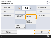 Kun kopioit samalla kopiosuhteella paperille, joka on saman kokoinen kuin alkuperäinen, kopioidun kuvan reunoista saattaa puuttua pieni osa. Voit välttää kuvan reunojen puuttumisen pienentämällä kuvan kokoa valitsemalla <Kopiosuhde> <Sovita sivulle>.Jos valitset asetuksen <Sovita sivulle>, <Siirto>-asetukseksi määritetään automaattisesti <Keskellä>. Et voi skannata erittäin läpinäkyviä alkuperäisiä, kuten piirtoheitinkalvoja, käyttämällä automaattista kopiosuhteen asetusta. Käytä Esiasetettua zoomausta tai Zoomausta prosentteina sen sijasta. Jos asetat <Aut.>, paperikoko on valittava manuaalisesti. Jos et valitse paperikokoa, kopiosuhde asetetaan automaattisesti vastaamaan paperikasettiin 1 asetun paperin kokoa. |