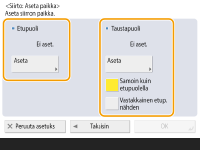 Jos haluat siirtää kuvan taustapuolelle molempia puolia kopioitaessa, <Taustapuoli> -asetus on valittava. Jos haluat siirtää samaan paikkaan kuin etupuolella, valitse <Sama kuin etupuolella>. Jos haluat siirtää symmetrisesti, valitse <Vastakkainen etup. nähden>. Jos haluat siirtää eri paikkaan kuin etupuolelle, valitse <Aseta> ja määritä siirtoetäisyys.