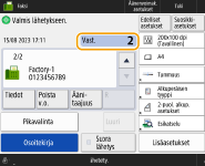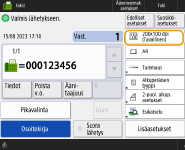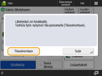Määritettyjen vastaanottajien määrän tarkistaminenMääritettyjen vastaanottajien määrä näkyy näytön oikeassa yläkulmassa. Näin voit varmistaa ennen lähettämistä, että vastaanottajien määrä on oikea. ![]() Lähetys lähettäjän tiedoillaVoit lähettää lähettäjän nimellä ja faksinumerolla. <Lähettäjän tiedot> Lähetettyjen asiakirjojen tilan tarkistaminen<Tilavalvonta>-näytössä voit tarkistaa lähetettyjen asiakirjojen tilan. Tässä ikkunassa voit lähettää faksit uudelleen tai peruuttaa lähetyksen tarkistuksen jälkeen. Lähetettyjen ja vastaanotettujen asiakirjojen tilan ja lokin tarkistaminen Kun <Näytä ilmoitus kun työ on hyväksytty> -asetuksena on <Kyllä>, <Tilavalvonta>-näyttö voidaan avata seuraavalla näytöllä, joka tulee esiin, kun lähetystyö vastaanotetaan. <Näytä ilmoitus kun työ on hyväksytty> ![]() Kun lähetysvirhe tapahtuu siksi että vastaanottajan linja on varattuLaite valitsee numeron uudelleen määrätyn ajan kuluttua. Voit vaihtaa asetuksia kuten montako kertaa laite valitsee numeron uudelleen ja uudelleenvalintojen välin. <Autom. uudelleenvalinta> Raportin tulostaminen lähetysten tuloksistaKun valitset faksin perustoimintonäytössä <Lisäasetukset> <Lähetystulos -raportti>, voit tulostaa automaattisesti raportin, joka sisältää lähetystulokset.Kun haluat asettaa tämän kullekin työlle kohdassa <Lisäasetukset>, sinun on valittava <Vain virhetilassa> tai <Ei> kohdassa <Lähetystulos -raportti> ja määritettävä <Salli tulostus lisäasetuksista> -asetukseksi <Kyllä>. Kun lähetyssä kuvassa olevat valokuvat ovat liian tummia tai vaaleita, värillisten alkuperäisten taustavärejä ei voi poistaaLähetetyn kuvan laatua voidaan ehkä parantaa, jos seuraavat ehdot/asetukset täytetään. Työn tyyppi: Faksi (muistilähetys) tai Skannaa ja lähetä (faksi/I-faksi) <Valitse väri>: <Mustav.> (Skannaa ja lähetä) <Alkuperäisen tyyppi>: <Teksti> <Tummuus> <Taustan tummuus>: <Aut.><Tarkkuus>: 200 dpi x 400 dpi, 300 dpi x 300 dpi*, 400 dpi x 400 dpi, tai 600 dpi x 600 dpi* *Voidaan määrittää toiminnolle Skannaa ja lähetä <Nopeus/laatu etusijalla mustavalkoskannauksessa> Faksin/I-faksin lähetystyöt: <Laatu etusijalla> (<Nopeus/laatu etusijalla mustavalkoskannauksessa>) |