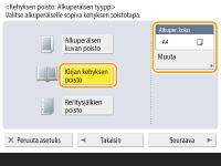 1 | Valitse <Kirjan kehyksen poisto> ja tarkista <Alkuper. koko>. ![]() Jos <Alkuper. koko> -kohdassa näkyvä koko ei ole sama kuin kirjan koko, valitse koko valitsemalla <Muuta>. Voit käyttää Kirjan kehyksen poisto -asetusta vain kosketusnäytössä näkyvien alkuperäisten kokojen kanssa. |