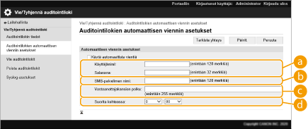 Jos [Auditointilokien automaattisen viennin asetukset] on käytössä, et voi poistaa valvontalokeja manuaalisesti.