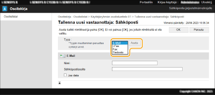4 | Tallenna tarvittavat tiedot ja valitse [OK]. Näytettävät tiedot riippuvat vastaanottajan tyypistä. Lisätietoja tallennettavista tiedoista on kohdassa Vastaanottajien tallentaminen osoitekirjaan. |