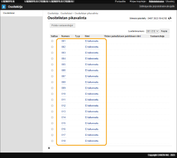 2 | Valitse [Ei tallennettu] tai tallentamaton pikavalintanumero. [Ei tallennettu] näkyy tallentamattomien pikavalintapainikkeiden [Nimi]-kohdassa. Näytä pikavalintapainikkeet, jotka eivät näy luettelossa, valitsemalla numeroalue [Luettelonumero]-kohdassa ja valitsemalla sitten [Näytä]. ![]() |
