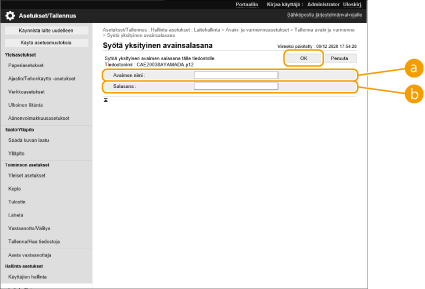 2 | Kirjoita avaimen nimi ja salasana ja valitse [OK]. [Avaimen nimi]Käytä aakkosnumeerisia merkkejä kun syötät avaimen nimen joka oli rekisteröity laitteeseen. [Salasana]Käytä aakkosnumeerisia merkkejä kun syötät yksityisen avaimen salasanan joka oli asetettu rekisteröitävään tiedostoon. |