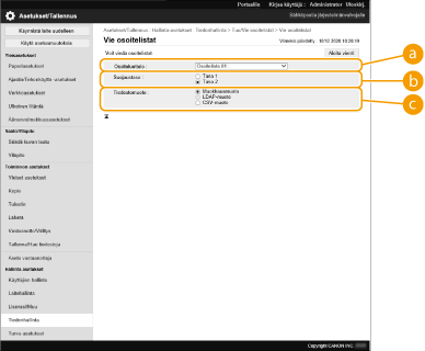 3 | Koosta tarvittavat asetukset. ![]() [Osoitelistat]Valitse vietävä osoitelista. Huomaa että kun osoitelistat on tallennettu, osoitelistojen nimet palaavat takaisin tehtaan oletusarvoihin. [Suojaustaso]Voit määrittää suojaustason, jos [Muokkausmuoto] on valittu [Tiedostomuoto] -kohdassa. Kun [Taso 1] on valittu, voit tuoda kaikkiin Canon-monitoimitulostimiin. Kun [Taso 2] on valittu, osoiteluettelon tietojen salasana on salattu turvallisemmalla menetelmällä kuin [Taso 1] -tasolla. Tietoja voidaan kuitenkin tuoda vain laitemalleihin, jotka tukevat [Taso 2] -asetusta (mallit, joissa näkyy [Suojaustaso] -asetus). [Tiedostomuoto]Valitse vietävän datan tiedostomuoto. Valitse [Muokkausmuoto], jos aiot tuoda kaikki toisen Canon-monitoimitulostimen osoiteluetteloihin tallennetut tiedot. Valitse [LDAP-muoto] tai [CSV-muoto], jos toinen tietokonesovellus käyttää tiedostoa. Huomaa kuitenkin, että jos [LDAP-muoto] on valittu, vain sähköpostiosoitteet ja faksinumerot tallennetaan. ![]() Salasanan määrittäminen viedyille tiedoille Määritä <Liitä salasana kun viet osoitekirjaa> -asetukseksi <Kyllä> (<Liitä salasana kun viet osoitekirjaa>). Kun asetus on määritetty, salasanan kirjoittamiskohteet näkyvät [Vie osoitelistat] -näytössä. Jos salasana on asetettu, data voidaan tuoda vain jos oikea salasana on syötetään. CSV-muodossa vietyjen tietojen muokkaaminen Tietoja osoitekirjan sarakkeista on kohdassa Osoitekirjan kohteet. Tietoja ei ehkä tuoda oikein, jos ne tuodaan laitteen vanhaan versioon. |