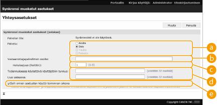 Synkronoinnin yhteyslokin tarkistaminenVoit tarkistaa yhteyslokin mukautettujen asetusten synkronointinäytössä. Loki voidaan myös ladata tiedostona. "Varoitus" tallennetaan, kun palvelin ei voi tilapäisesti muodostaa yhteyttä. "Virhe" tallennetaan, kun tallennettavien tietojen enimmäismäärä on ylitetty tai palvelimen todennus epäonnistuu. Yksinkertaiset synkronointiasetuksetMukautettujen asetusten synkronointi voidaan aloittaa saman reitittimen Canon-monitoimitulostien käyttöpaneelissa. Asiakaslaite: Valitse (Asetukset Rekisteröi) <Hallinta-asetukset> <Laitehallinta> määritä <Synkronoi muokatut asetukset (asiakas)> -asetukseksi <Ota käyttöön>.Käyttäjän autentikointi on otettava käyttöön autentikointitavaksi. Huomiot synkronointia peruttaessaJos asiakaslaite peruuttaa mukautettujen asetusten synkronoinnin, asiakaslaite ei voi hakea kaikkien palvelimeen tallennettujen käyttäjien asetuksia. Huomioi tämän vuoksi, että asiakaslaitteen mukautetut tiedot eivät ehkä ole uusimpia mukautettujen asetusten synkronoinnin peruuttamisen jälkeen. |